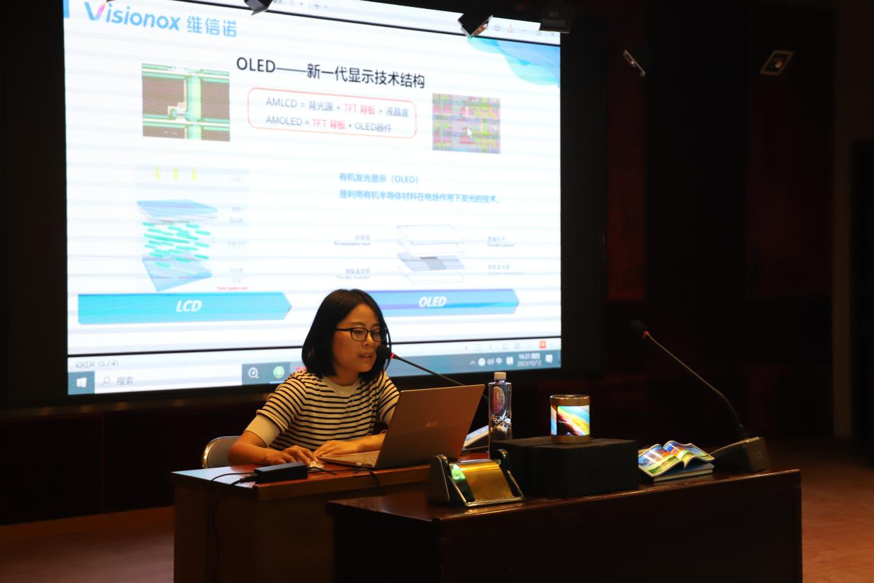 維信諾公司的曹英老師,作為失效分析組的主管,為在場師生分享了顯示技術(shù)的奧秘。她在講座中介紹了顯示技術(shù)的基本原理,以及OLED(有機發(fā)光二極管)的工作原理和應(yīng)用。尤其引人入勝的是,曹英老師詳細探討了柔性OLED的前景和在多個領(lǐng)域的應(yīng)用,引領(lǐng)觀眾們走進未來的顯示科技世界。