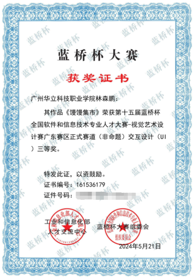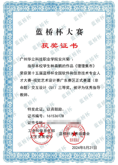 近日,我院傳來喜訊。在第十五屆藍(lán)橋杯全國軟件和信息技術(shù)專業(yè)人才大賽中,我院學(xué)子林森鵬的作品《饅饅集市》榮獲視覺藝術(shù)設(shè)計賽廣東賽區(qū)正式賽道(非命題)交互設(shè)計(UI)三等獎,指導(dǎo)教師安興菊、孫夢琳兩位老師榮獲優(yōu)秀指導(dǎo)教師獎。這一榮譽(yù)不僅是對學(xué)生個人能力的肯定,也體現(xiàn)了學(xué)院在信息技術(shù)和藝術(shù)設(shè)計教育領(lǐng)域的卓越成果。