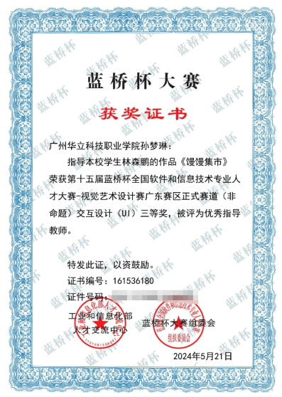 近日,我院傳來喜訊。在第十五屆藍(lán)橋杯全國軟件和信息技術(shù)專業(yè)人才大賽中,我院學(xué)子林森鵬的作品《饅饅集市》榮獲視覺藝術(shù)設(shè)計賽廣東賽區(qū)正式賽道(非命題)交互設(shè)計(UI)三等獎,指導(dǎo)教師安興菊、孫夢琳兩位老師榮獲優(yōu)秀指導(dǎo)教師獎。這一榮譽(yù)不僅是對學(xué)生個人能力的肯定,也體現(xiàn)了學(xué)院在信息技術(shù)和藝術(shù)設(shè)計教育領(lǐng)域的卓越成果。