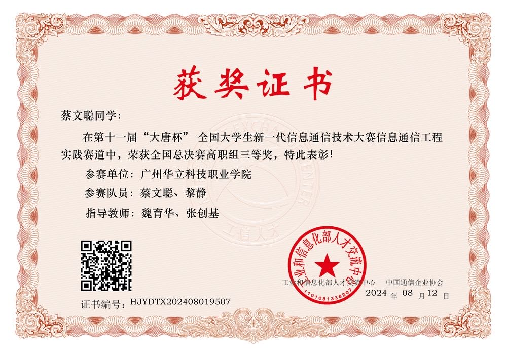 2024年7月10日至11日,由工業(yè)和信息化部人才交流中心和中國通信企業(yè)協(xié)會共同舉辦的第十一屆“大唐杯”全國大學(xué)生新一代信息通信技術(shù)大賽全國總決賽在武漢職業(yè)技術(shù)學(xué)院隆重舉行,大賽結(jié)束后組委會正式公布獲獎名單并頒獎,廣州華立科技職業(yè)學(xué)院計算機與信息工程學(xué)院蔡文聰和黎靜2位同學(xué)在比賽中不畏強手、頑強拼搏,經(jīng)過激烈角逐,最終榮獲全國總決賽高職組三等獎。