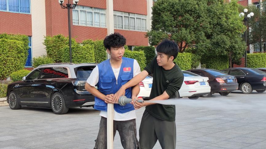 活動最后,利用消防水槍的講解和實操體驗,讓學生真切的感受消防水槍的使用同時也對消防安全演練場地地面進行打掃,水槍也是消防中非常關鍵,也是非常有效的措施。