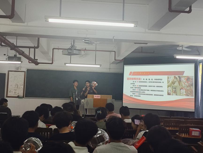 為更好的讓師生有深刻的體驗,學院準備了批量的消防防毒面具和保衛(wèi)處準備滅火器以及滅火器的實驗地點,并在實操之前對消防工具進行講解和步驟學習。在學習防毒面罩的知識和步驟后,便開始了開展師生防毒面罩的使用實操,加深其防毒面罩的使用印象。
