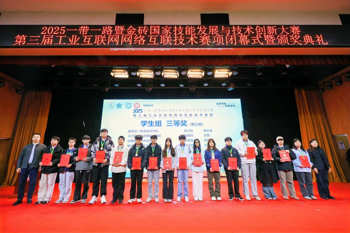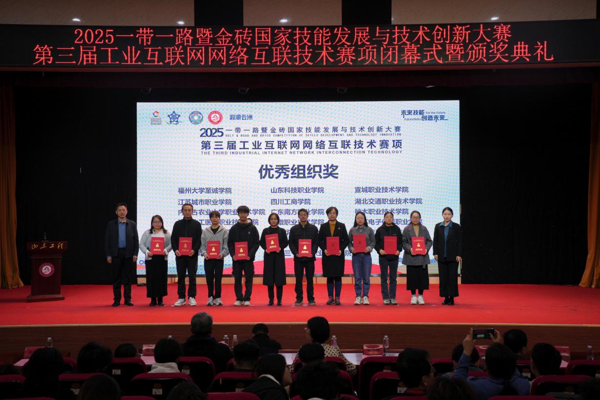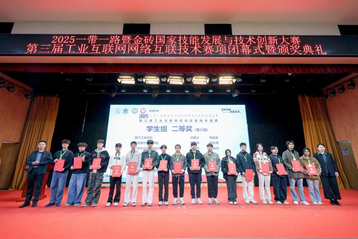 2025年11月7日-9日,2025年“一帶一路”暨金磚國家技能發(fā)展與技術(shù)創(chuàng)新大賽第三屆工業(yè)互聯(lián)網(wǎng)網(wǎng)絡(luò)互聯(lián)技術(shù)賽項全國總決賽在山東工程職業(yè)技術(shù)大學(xué)隆重舉行,吸引了來自全國81所院校的132支參賽隊伍同場競技。我校計算機(jī)信息工程學(xué)院閔小翠、王建華老師指導(dǎo)選派的兩支代表隊(1隊:馮俊杰,劉俊浩、2隊:彭依琳,魏淙正),在全國總決賽賽場上,歷經(jīng)四小時的激烈比拼,最終憑借扎實的專業(yè)知識、科學(xué)的團(tuán)隊協(xié)作,最終脫穎而出,榮獲全國總決賽二等獎1項、三等獎1項,為學(xué)校贏得榮譽。我校榮獲“優(yōu)秀組織獎”、兩位指導(dǎo)教師榮獲“優(yōu)秀指導(dǎo)教師”稱號。