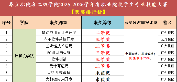 根據(jù)本次省職業(yè)院校學(xué)生專業(yè)技能大賽獲獎數(shù)據(jù)顯示,計算機信息工程學(xué)院共申報 8 個賽項,斬獲 6 項獎項,獲獎率達 75%。其中,“移動應(yīng)用設(shè)計與開發(fā)” 賽項榮獲二等獎,“應(yīng)用軟件系統(tǒng)開發(fā)”“區(qū)塊鏈技術(shù)應(yīng)用”“5G 組網(wǎng)與運維”“軟件測試”“云計算應(yīng)用” 5 個賽項分別斬獲三等獎,充分展現(xiàn)了學(xué)院在計算機應(yīng)用技術(shù)領(lǐng)域的扎實教學(xué)功底與學(xué)生過硬的專業(yè)技能。