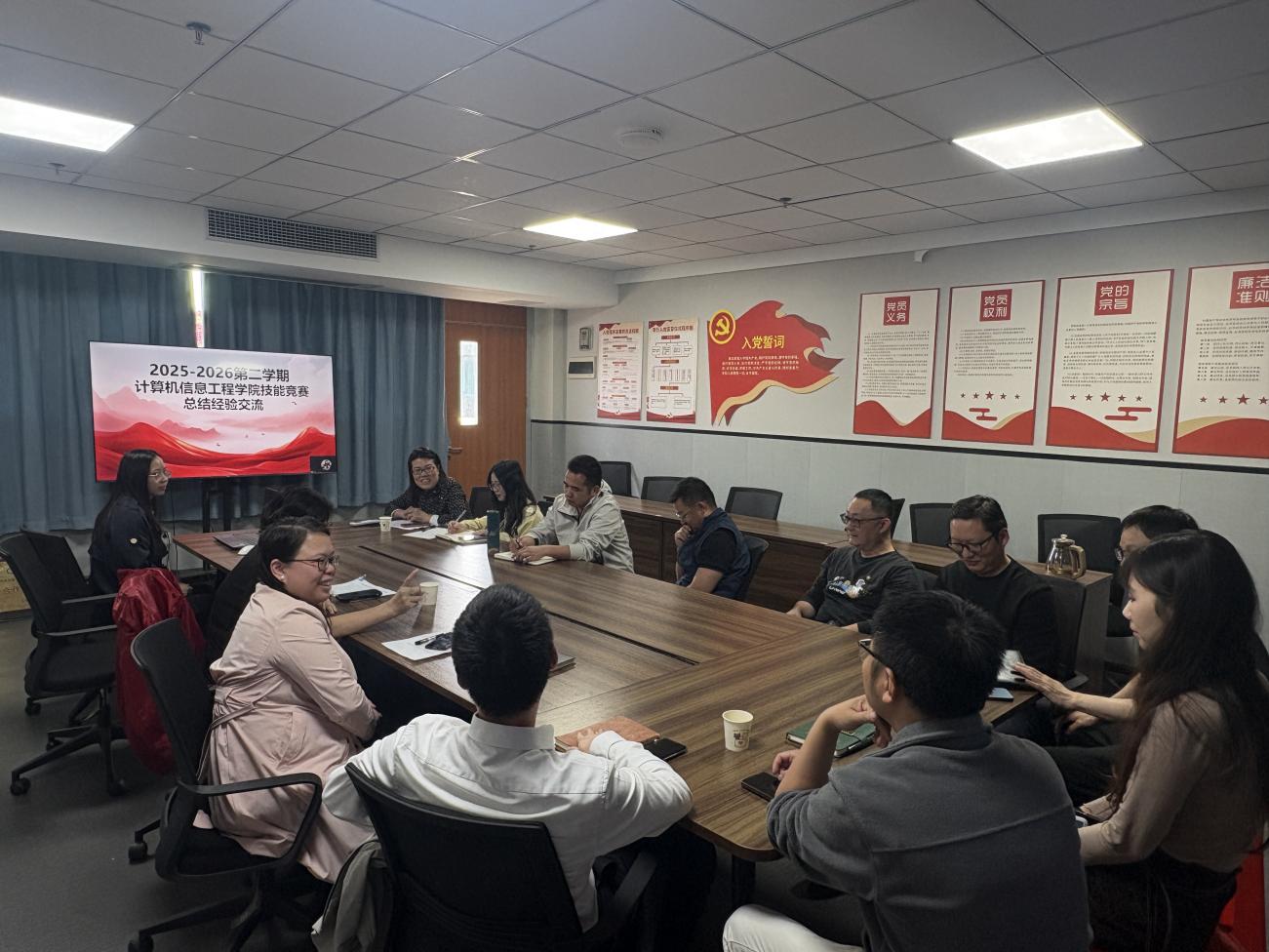 為總結(jié)競賽經(jīng)驗、凝練育人成果,推動專業(yè)技能人才培養(yǎng)質(zhì)量提升,2026年3月16日,計算機信息工程學(xué)院在會議室召開廣東省職業(yè)技能競賽總結(jié)經(jīng)驗交流會。學(xué)院院長王建華、副院長閔小翠,教科研主任及競賽指導(dǎo)老師(云浮校區(qū)線上參加)齊聚一堂,圍繞省職業(yè)院校學(xué)生專業(yè)技能大賽參賽與獲獎情況展開深入交流。