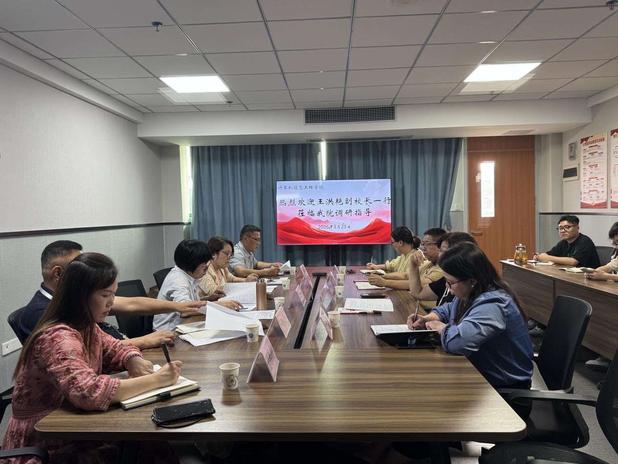 2026 年 3 月 25 日,副校長(zhǎng)王洪艷一行蒞臨計(jì)算機(jī)信息工程學(xué)院,對(duì)學(xué)院專業(yè)群建設(shè)、學(xué)生競(jìng)賽、人才培養(yǎng)、黨支部建設(shè)等工作開展專題調(diào)研指導(dǎo)。教務(wù)處處長(zhǎng)孫麗英及教務(wù)處相關(guān)人員陪同調(diào)研。學(xué)院院長(zhǎng)王建華、黨總支書記宋海泉、副院長(zhǎng)閔小翠、副院長(zhǎng)蘇越,以及各教研室負(fù)責(zé)人、教師代表參加調(diào)研座談會(huì)。