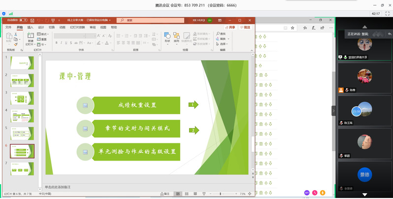 會(huì)上,隗波揚(yáng)副院長(zhǎng)首先代表學(xué)院部署了本學(xué)期的工作。謝慧琪老師根據(jù)自己親身教學(xué)經(jīng)驗(yàn)向大家分享了超星平臺(tái)教學(xué)以及網(wǎng)絡(luò)教學(xué)小技巧,楊金玲老師根據(jù)自己所教學(xué)的校級(jí)精品在線課程《英語寫作》,在會(huì)議上分享了釘釘、超星等平臺(tái)教學(xué)經(jīng)驗(yàn)以及具體如何通過軟件錄課。尤前前老師分享了自己的考證課程網(wǎng)絡(luò)教學(xué)經(jīng)驗(yàn)。莫令航老師則向大家介紹了雙語課程網(wǎng)絡(luò)課程教學(xué)經(jīng)驗(yàn)。