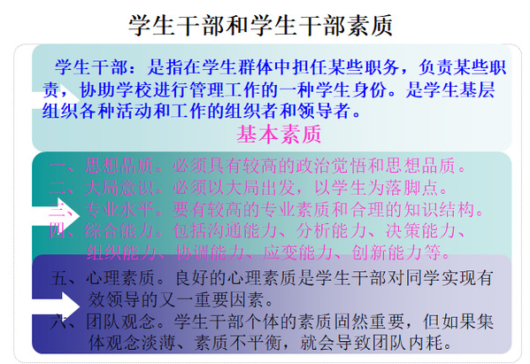 第二講由鄭慶國老師授之“學(xué)生干部的素質(zhì)培養(yǎng)及領(lǐng)導(dǎo)力提升”課程。首先,鄭慶國老師強調(diào)作為一名學(xué)生干部的基本素質(zhì)和應(yīng)盡的職責(zé)。接著指出,應(yīng)該做到學(xué)習(xí)工作兩不誤,合理的安排兩者之間的時間。隨后講到作為學(xué)生干部應(yīng)該如何工作更加的合理和學(xué)生干部應(yīng)該怎么做做出了要求。最后,鄭慶國老師提醒學(xué)生干部現(xiàn)在應(yīng)該要做的三件事情,分別是:行動,規(guī)劃和調(diào)整。目的是讓學(xué)生干部在大學(xué)生活里不要迷茫,讓學(xué)生干部要明確自己的目標(biāo)和計劃,有了計劃就要付出行動,這樣的大學(xué)生活才不會迷茫,才有方向。