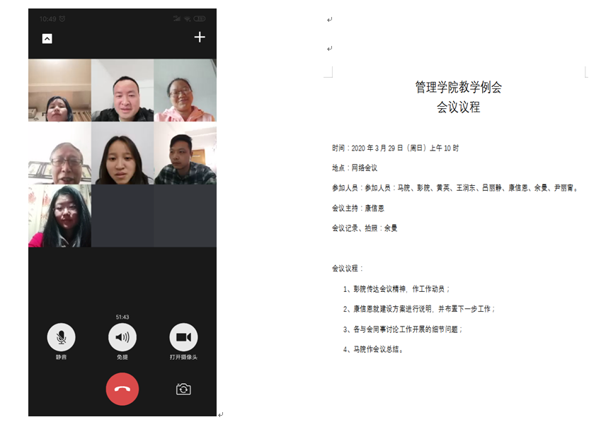 為貫徹學(xué)校關(guān)于網(wǎng)絡(luò)課程建設(shè)工作推進(jìn)會(huì)會(huì)議精神,落實(shí)網(wǎng)絡(luò)教學(xué)常態(tài)化的制度建設(shè),把網(wǎng)絡(luò)教學(xué)中的課程建設(shè)工作貫徹落實(shí)、落細(xì)、落地。同時(shí)進(jìn)一步明確和完善網(wǎng)絡(luò)教學(xué)課程建設(shè)相關(guān)工作,管理學(xué)院及時(shí)于2020年3月29日上午10點(diǎn)通過(guò)微信視頻方式召開(kāi)了網(wǎng)絡(luò)課程建設(shè)工作布置會(huì)議,管理學(xué)院馬林院長(zhǎng)、彭柳副院長(zhǎng)、校內(nèi)教學(xué)副主任康信恩老師、各系主任及教學(xué)線老師參加了本次會(huì)議。