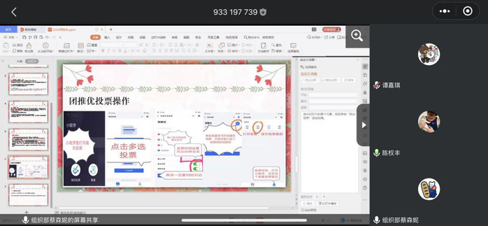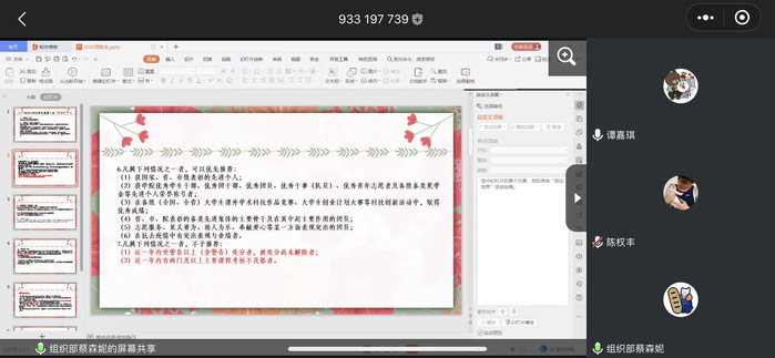 國(guó)貿(mào)學(xué)院團(tuán)總支學(xué)生會(huì)組織部部長(zhǎng)蔡森妮同學(xué)詳細(xì)向18、19級(jí)團(tuán)支書介紹了有關(guān)團(tuán)推優(yōu)需要注意的事項(xiàng):一、本次團(tuán)推優(yōu)對(duì)象為我校在讀的18、19級(jí)團(tuán)員,參與團(tuán)推優(yōu)者需要符合團(tuán)推優(yōu)的基本條件才可進(jìn)行團(tuán)推優(yōu)。二、各個(gè)團(tuán)支部有一定的團(tuán)推優(yōu)人數(shù),在團(tuán)推優(yōu)過程中要公平公正不能出現(xiàn)包庇、爭(zhēng)鋒相對(duì)的現(xiàn)象。三、團(tuán)推優(yōu)和團(tuán)支部大會(huì)的程序:由于疫情影響,今年的團(tuán)推優(yōu)程序在線上開展,由團(tuán)支部召開支部團(tuán)員大會(huì)。