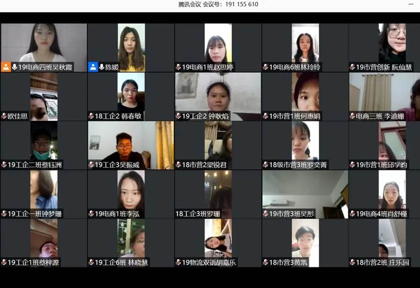 頒獎(jiǎng)大會(huì)于2020年6月3日晚上7點(diǎn)30分在騰訊會(huì)議上舉行。參加人員:管理學(xué)院團(tuán)總支書記陳媛老師、團(tuán)總支書記助理莫佩珊同學(xué)、團(tuán)總支常務(wù)副書記丁偉金同學(xué)、學(xué)生會(huì)主席黃天龍同學(xué)、學(xué)生會(huì)副主席陳嘉琪同學(xué)以及管理學(xué)院18、19級(jí)活動(dòng)參賽同學(xué)、主持人吳秋霞同學(xué)。
