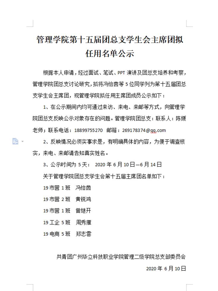 團(tuán)總支學(xué)生會(huì)是學(xué)校聯(lián)系學(xué)生的橋梁和紐帶,是學(xué)校管理的助手和主力軍,團(tuán)總支學(xué)生會(huì)工作的發(fā)展是學(xué)生們共同的希望。廣州華立科技職業(yè)學(xué)院管理學(xué)院團(tuán)總支學(xué)生會(huì)第十五屆主席團(tuán)第四輪競(jìng)選于2020年6月9日晚上7點(diǎn)30分通過(guò)騰訊視頻會(huì)議線(xiàn)上舉行。