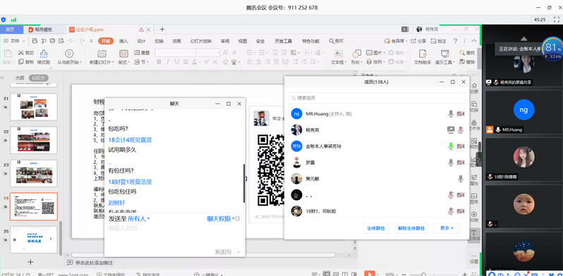 宣講會以騰訊會議的形式舉行,由黃冠霖老師主持。在網絡招聘宣講會上,金賬本會計服務(廣東)有限公司、深圳鼎泰財務公司、深圳中倫會計師事務所、東莞立勤會計服務有限公司以及中國平安分別就各自企業(yè)的發(fā)展前景、企業(yè)成就、招聘崗位、專業(yè)要求、工作地點、晉升政策、薪資待遇、員工福利、企業(yè)文化等方面作了具體的講解與介紹。在宣講中,同學們分別咨詢個人職業(yè)發(fā)展前景、公司發(fā)展理念等相關問題。
