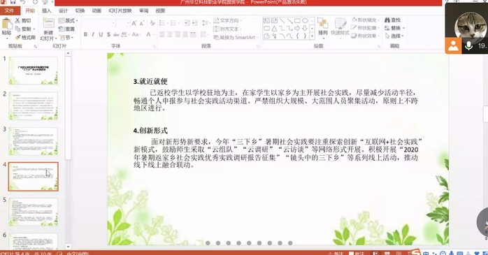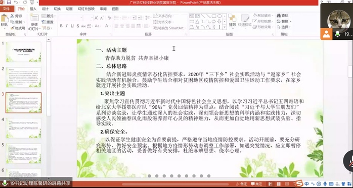 首先,陳馨妍同學(xué)給大家講述活動(dòng)的主題,是以“青春助力脫貧,共奔幸福小康”為主題的三下鄉(xiāng)社會(huì)實(shí)踐活動(dòng)。講解活動(dòng)的總體思路,要結(jié)合新冠肺炎疫情常態(tài)化防控要求,鼓勵(lì)學(xué)生結(jié)合相對(duì)貧困地區(qū)疫情和愛國衛(wèi)生運(yùn)動(dòng)工作要求,在家鄉(xiāng)就近開展社會(huì)實(shí)踐活動(dòng),活動(dòng)要求突出主題,確保安全,就近就便,創(chuàng)新行式。