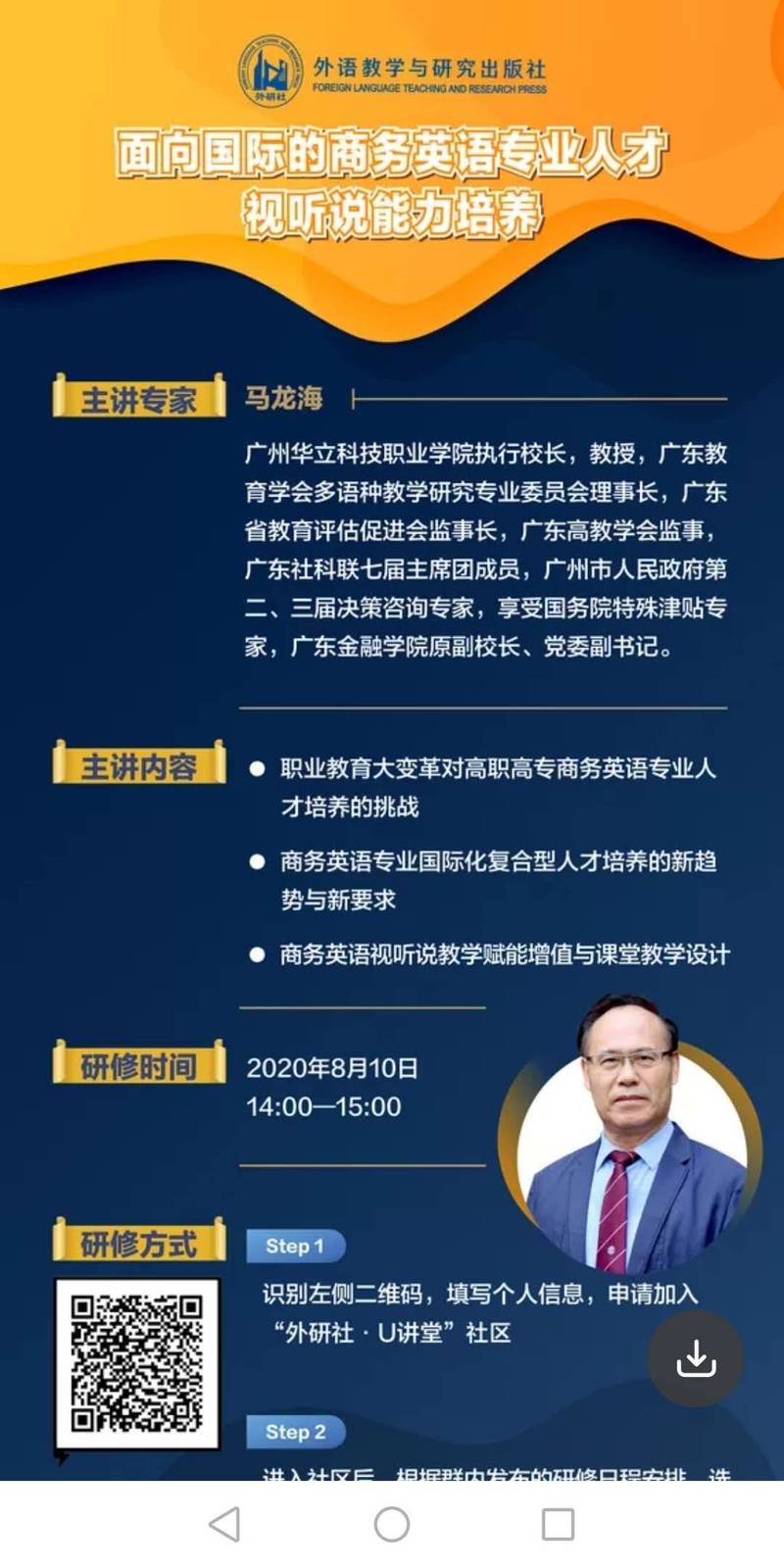 8月10日下午2:00,“外研社·U講堂社區(qū)”直播講座在釘釘群如期舉行。廣州華立科技職業(yè)學院馬龍海教授為大家?guī)砹恕睹嫦驀H的商務英語人才視聽說能力培養(yǎng)》主題講座。