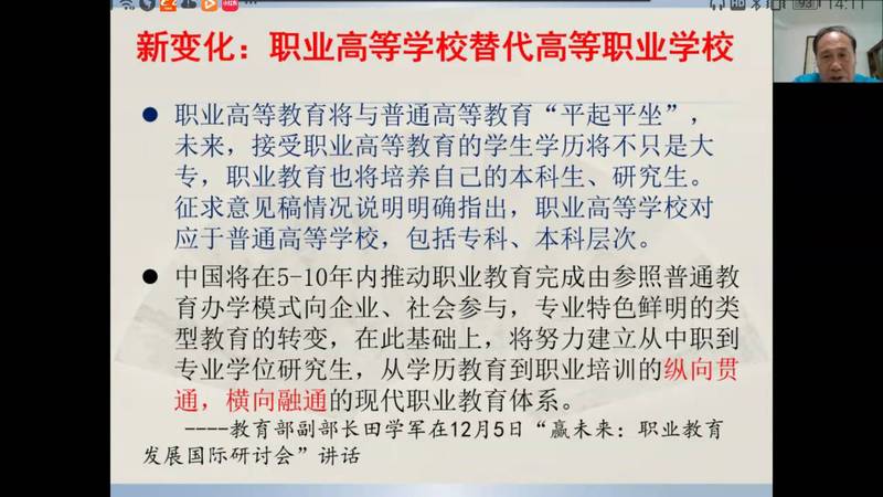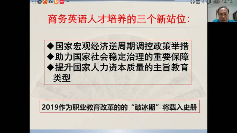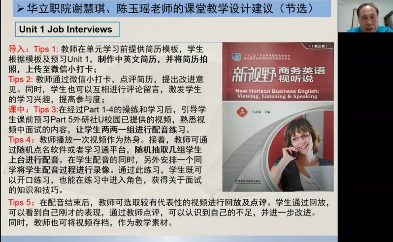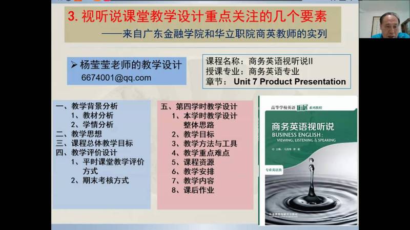 直播講座中,馬龍海教授就職業(yè)教育大變革對高職高專商務英語專業(yè)人才培養(yǎng)的挑戰(zhàn)進行了詳細解讀,幫助教師深化了對職業(yè)教育大變革帶來的“三個新站位”,四個“新定位”的認識,并指出內(nèi)涵發(fā)展是適應職業(yè)教育改革的必然選擇。分析了商務英語專業(yè)國際化復合型人才培養(yǎng)的新趨勢與新要求,要培養(yǎng)適應現(xiàn)代化的復合型人才應聚焦和回歸到課程改革,因為課程是學生消費高等教育資源的基本單位,是高等學校一切辦學行為和人財物資資源配置的最終載體,是學校人才培養(yǎng)質量內(nèi)涵建設水平的標志和落腳點,決定著學校品牌影響力與核心競爭力的形成。并從理念更新取向、體系構建取向、教學能力取向、方法載體取向四個維度,就如何進行課程建設提出建議。馬龍海教授強調(diào),在職業(yè)教育課程體系構建的關鍵點是工作過程導向;教師要作學生成長的引路人,要注重交叉跨界能力;產(chǎn)教融合是職業(yè)教育的精髓和改革方向,在每一點的講解中,馬龍海教授都結合了《新視野商務英語綜合教程(智慧版)》或《新視野商務英語視聽說(第三版)》的教材編寫理念,以之為例,說明如何落實課程改革,如何培養(yǎng)商務復合型人才,如何結合現(xiàn)代化信息技術手段。商務英語視聽說教學應進一步明確培養(yǎng)目標,創(chuàng)新商務英語人才培養(yǎng);對標教學效能標準;打造適應“新商科”發(fā)展需要的教師課程團隊;采用與時俱進的教學方法和載體。并著重對商務英語視聽說課堂教學提出建議,為廣大教師講解了“肯普模式”的教學設計的框架結構,并指出視聽說課堂教學設計重點關注的要素,并分享和點評了廣東金融學院楊瑩瑩老師和華立科技職業(yè)學院謝慧琪、陳玉瑤老師的教學設計建議。當前職業(yè)高等教育已經(jīng)發(fā)展到了國家戰(zhàn)略層面,職業(yè)教育從民生領域“置頂”于宏觀政策領域,就業(yè)導向的職業(yè)教育必須將自身的功能與國家和歷史的重任緊密相連。