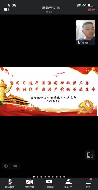 2020年9月28日,國貿(mào)學(xué)院黨總支第二黨支部在騰訊會議平臺開展了“學(xué)習(xí)習(xí)近平談治國理政第三卷——新時代中國共產(chǎn)黨的歷史使命”組織生活會。參加本次會議的有:國貿(mào)學(xué)院第二黨支部書記劉偉鑫老師以及18級預(yù)備黨員。