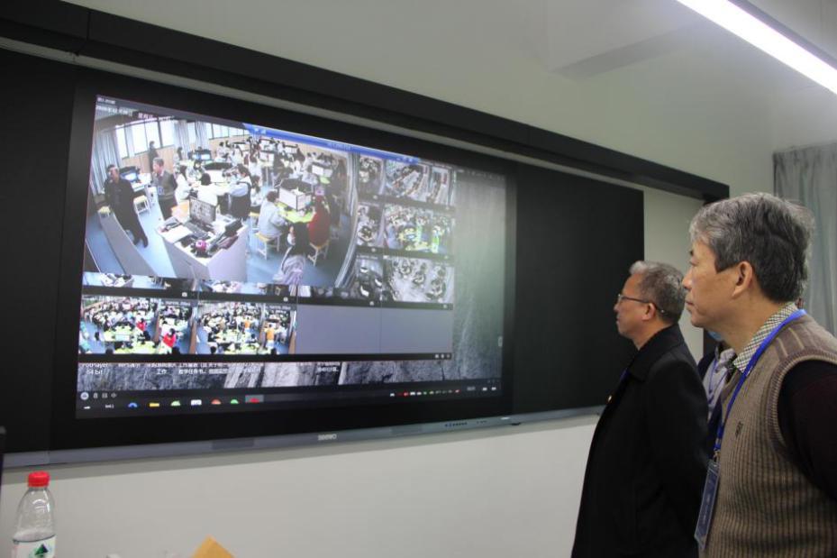 主考官何處長和副考官隗院長正通過監(jiān)控考察考場情況