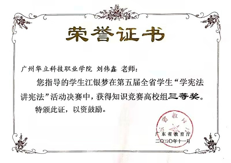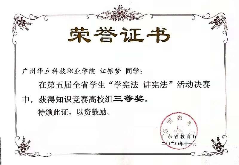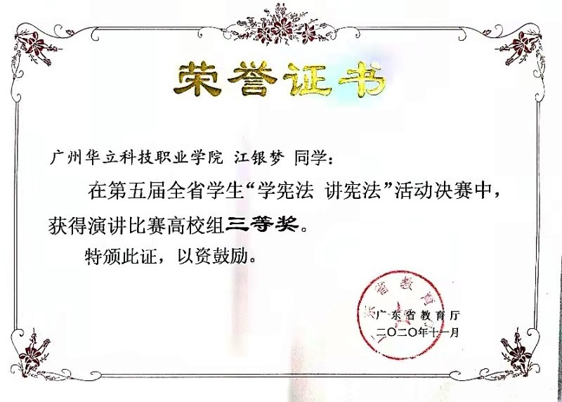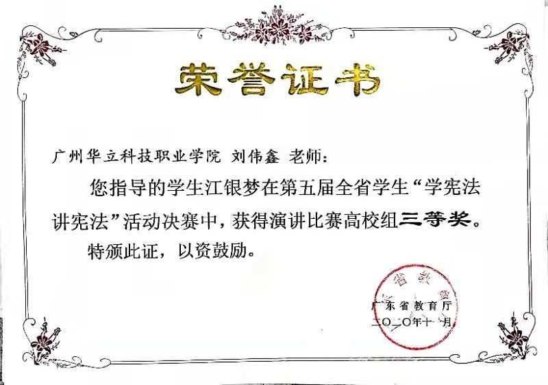 2021年1月12日由廣東省教育廳主辦的“第五屆全國學(xué)生‘學(xué)憲法,講憲法’活動(dòng)”落下帷幕,由我校劉偉鑫老師指導(dǎo)的江銀夢(mèng)同學(xué)分別獲得第五屆全國學(xué)生“學(xué)憲法 講憲法”廣東省知識(shí)競(jìng)賽高校組、演講比賽高校組三等獎(jiǎng)的佳績。