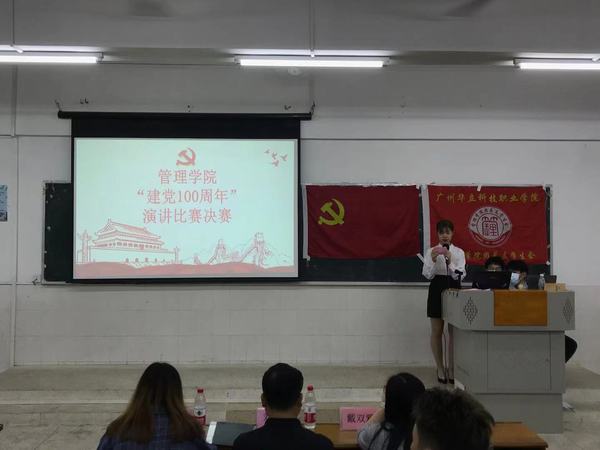 廣州華立科技職業(yè)學(xué)院管理學(xué)院建黨一百周年演講比賽決賽在2021年4月27日5:40分在圖書(shū)館604舉行,主題為“青春心向黨,建功新時(shí)代”。