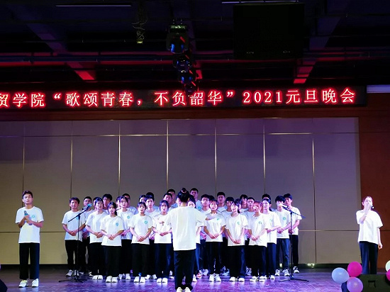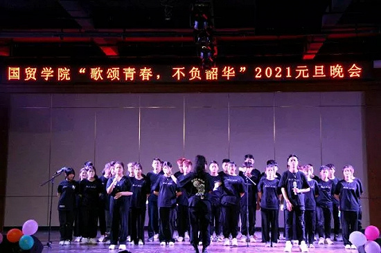 在大合唱的歌聲中主持人也隨之宣布國貿(mào)學(xué)院“歌頌青春,不負韶華”2021元旦晚會圓滿結(jié)束。