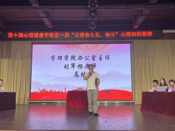 最后由管理學(xué)院辦公室主任劉軍根老師上臺(tái)總結(jié)講話,首先恭喜獲獎(jiǎng)隊(duì)伍。他希望以此活動(dòng)為契機(jī),讓更多同學(xué)參與進(jìn)來(lái),通過(guò)各項(xiàng)活動(dòng)與途徑,加強(qiáng)心理健康知識(shí)的學(xué)習(xí)和傳播,普及健康心理知識(shí),提高大學(xué)生的心理素質(zhì)和處理心理問(wèn)題的能力。他呼吁廣大青年學(xué)生一定要積極響應(yīng)習(xí)近平書(shū)記的號(hào)召,立志做一名德才兼?zhèn)?、身心健康的社?huì)主義建設(shè)者和接班人。