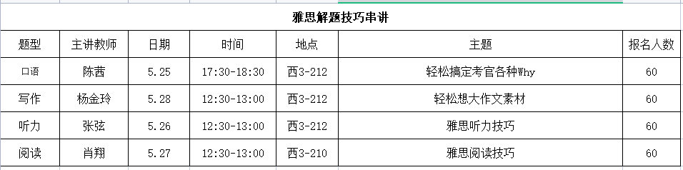 為提升我校學生雅思考試解題技巧,國際經(jīng)濟與外語學院國際班教師將針對考試模塊進行串講,具體安排如下: