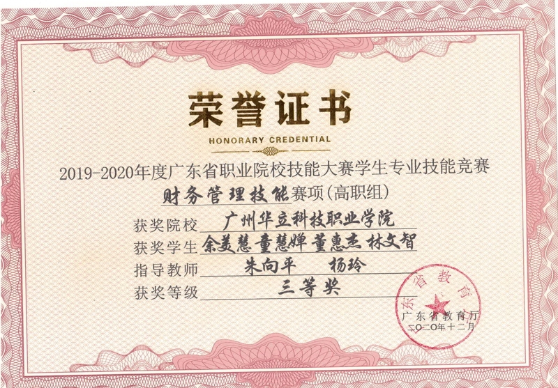 榮獲2019-2020年度廣東省職業(yè)院校技能大賽財(cái)務(wù)管理技能賽項(xiàng)三等獎(jiǎng)