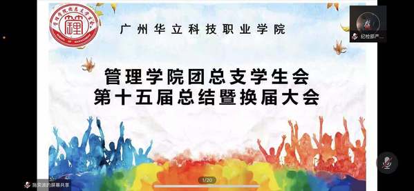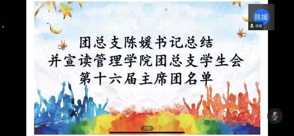 2021年6月17日于線上騰訊會議舉辦管理學院團總支學生會第十五屆總結(jié)暨換屆大會,參加本次會議的領(lǐng)導和嘉賓有管理學院管理副主任唐濤老師、管理學院團總支書記陳媛老師、輔導員戴雙雅老師、輔導員熊靈芝老師、輔導員張南南老師、輔導員鄧念平老師、輔導員吳小宇老師、管理學院團總支學生會第十五屆主席團成員以及新一屆主席團成員和各部門部長和成員。