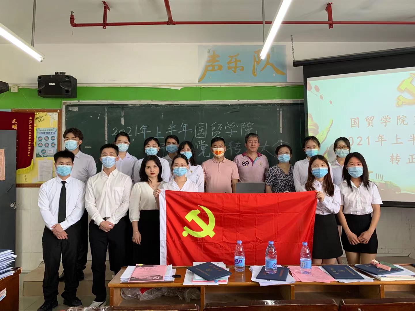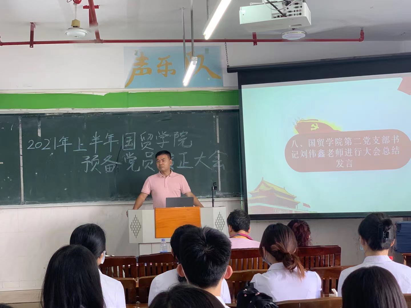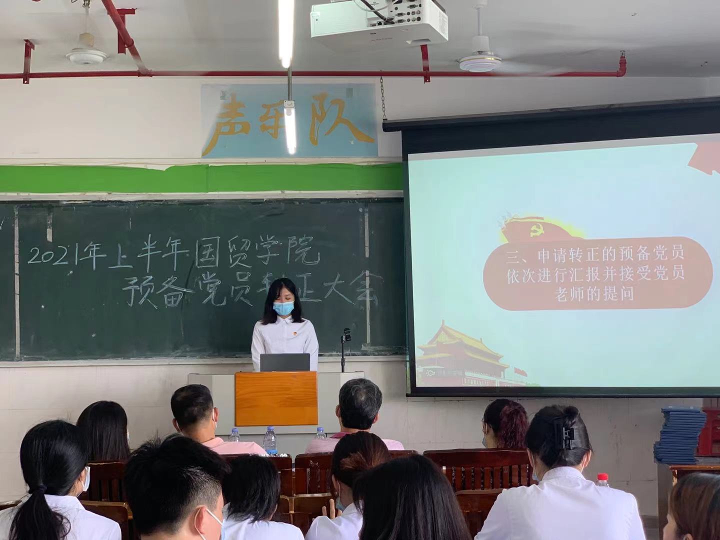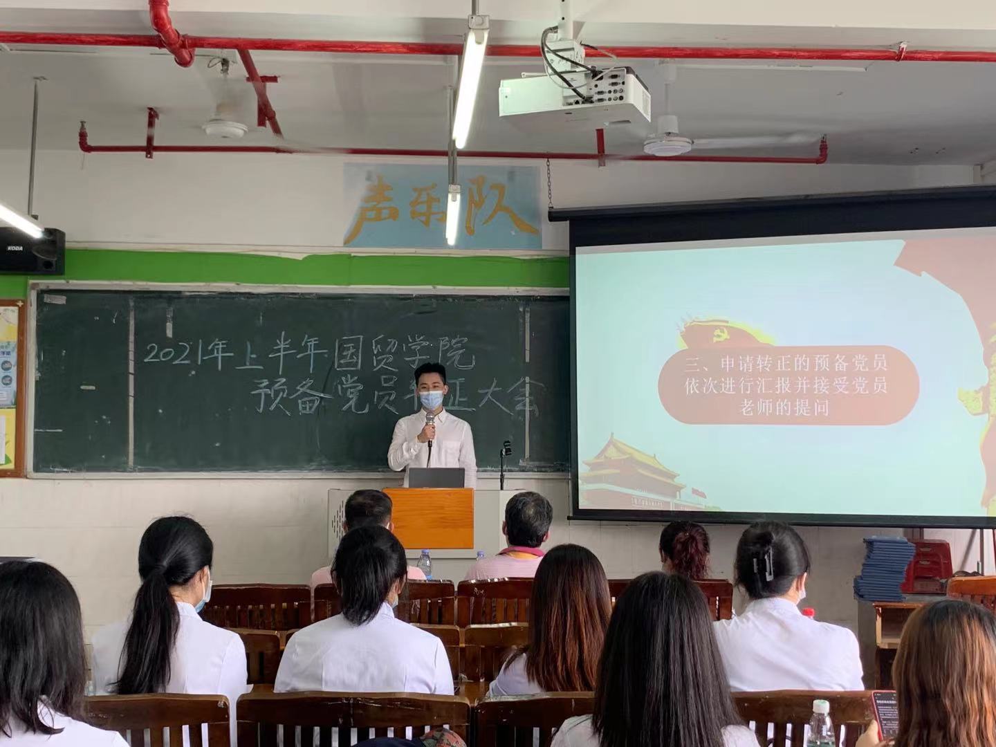在2021年7月4日12:00,國貿(mào)學(xué)院黨總支在西一教學(xué)樓409召開了預(yù)備黨員轉(zhuǎn)正大會。參加的老師有國貿(mào)學(xué)院第二黨支部書記劉偉鑫老師、國貿(mào)學(xué)院黨總支第二黨支部紀(jì)檢委員陳曉薇老師、國貿(mào)學(xué)院組織委員鄭慶國老師以及學(xué)生黨員代表。