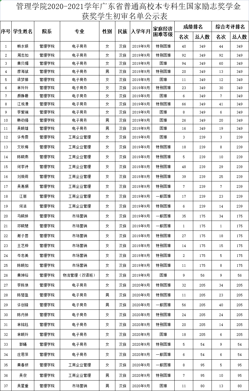 根據(jù)《關(guān)于做好我校2020-2021學(xué)年國(guó)家獎(jiǎng)助學(xué)金評(píng)審的通知》文件的有關(guān)要求,經(jīng)學(xué)生本人申請(qǐng),各班級(jí)民主評(píng)議,學(xué)院評(píng)定小組審核,我學(xué)院擬推薦賴(lài)水銀等37位同學(xué)為2020-2021學(xué)年度國(guó)家勵(lì)志獎(jiǎng)學(xué)金獲獎(jiǎng)學(xué)生。按照公開(kāi)、公平、公正的原則,現(xiàn)將推薦名單予以公示,公示期為2021年9月26日-9月28日,如有異議,請(qǐng)?jiān)诠酒趦?nèi)進(jìn)行反映。