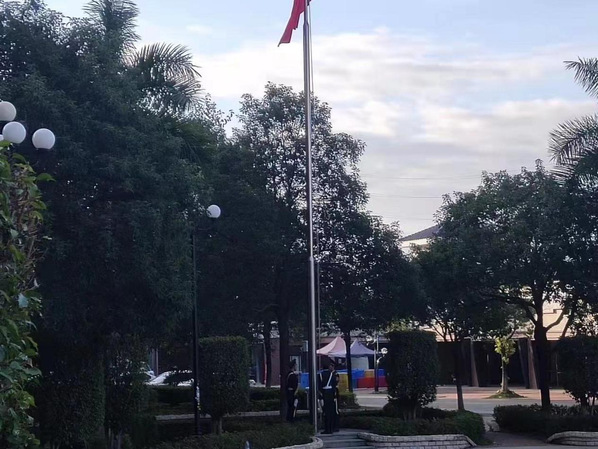首先由本次升旗儀式主持人楊彩珍同學(xué)為大家介紹本次儀式出席嘉賓,隨之她宣布升旗儀式正式開始。在全體師生的注目下,五星紅旗緩緩升起,在晨曦中迎風(fēng)飄揚(yáng)在學(xué)校的上空,在場的每一個(gè)人都向國旗行注目禮,深懷對祖國無限的熱愛和崇高的敬意。