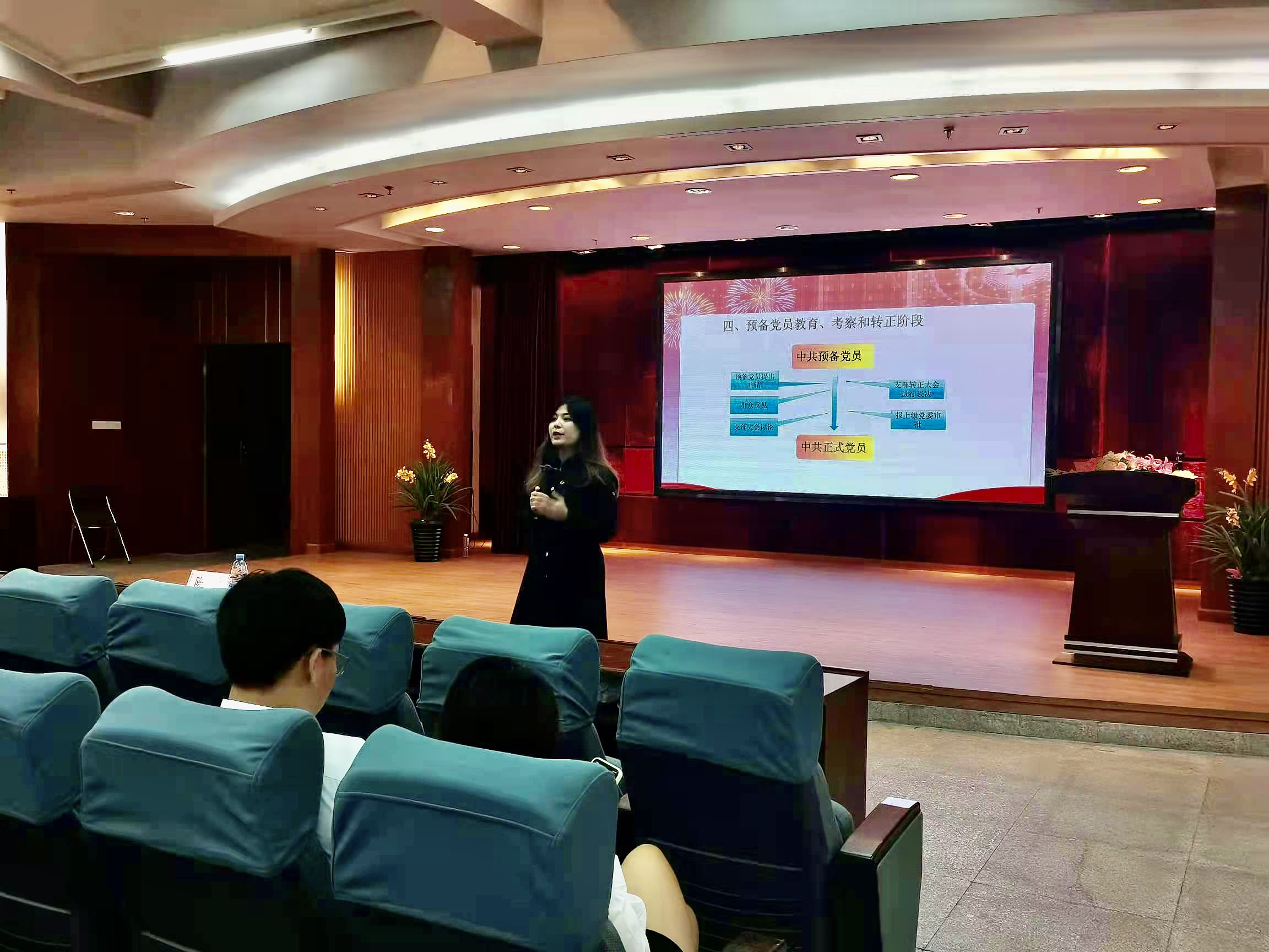 由第二黨支部組織(宣傳)委員陳媛同志講解發(fā)展黨員階段的五個流程:申請入黨階段,積極分子階段,發(fā)展對象階段,吸收為預備黨員階段,正式黨員階段。其中在申請入黨階段,她特別強調入黨的同志需自愿提出入黨申請,并上交入黨申請書,期間可以先了解入黨的流程和要求。同時鼓勵申請入黨的青年團員積極參加黨校培訓,通過黨校培訓端正入黨動機,提高理論基礎。
