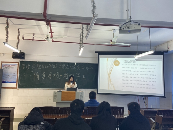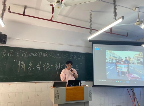 緊接著,管理學(xué)院學(xué)生會(huì)第一學(xué)期執(zhí)行主席施奕波同學(xué)為參與寒假社會(huì)實(shí)踐活動(dòng)的同學(xué)們簡單介紹了去年回訪母校的經(jīng)歷和一些經(jīng)驗(yàn)。