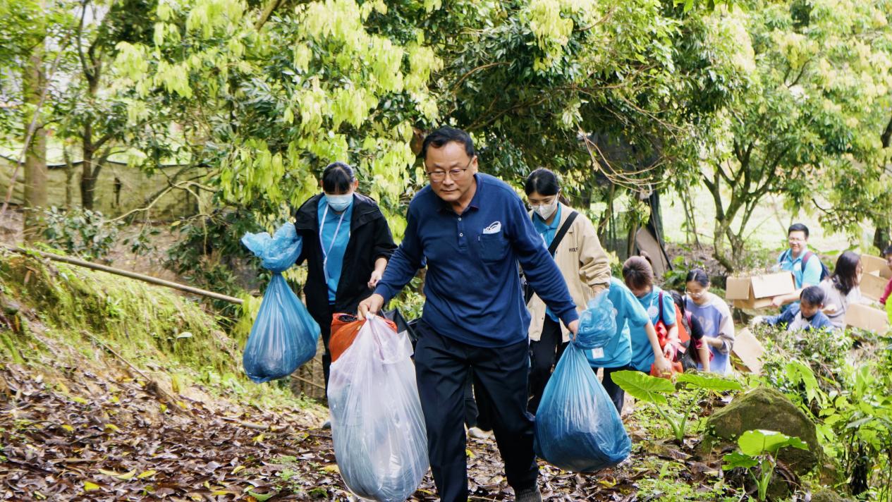 在參觀學習之后,我院師生扛大箱鐵皮石斛苗提小袋工具材料,踏上了她們好奇的“荔枝樹上種石斛”之路了。連日的陰雨使荔枝樹干充分濕潤,有利于鐵皮石斛的生長,但也會讓山路泥濘林下濕滑,但是這些困擾阻擋不了我院師生澎湃的激情。