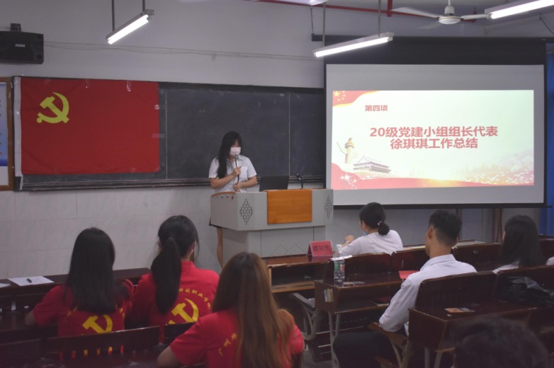 20級(jí)黨建小組組長(zhǎng)代表徐琪琪工作總結(jié),她總結(jié)了這一學(xué)年以來(lái)獲得的成績(jī)與不足之處,并對(duì)以后的工作提出了要求以及改正的方法,最后她代表各位黨建小組組長(zhǎng)給新的黨建干部送上鼓勵(lì)和美好的祝福。