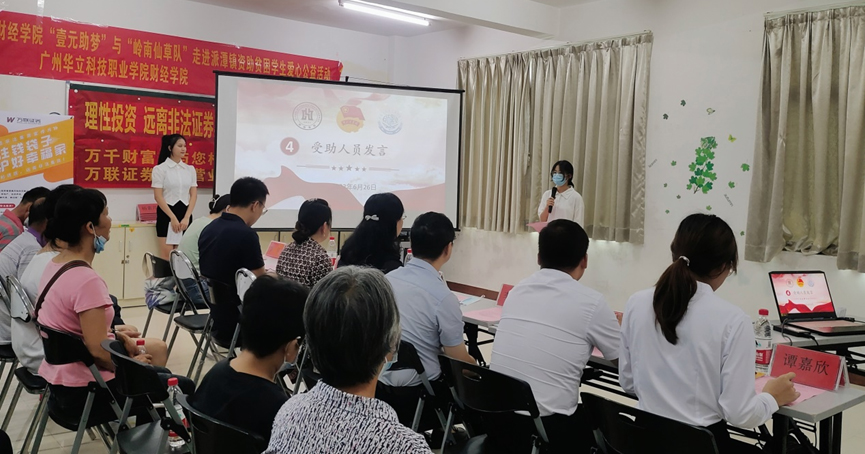 上午十點,活動正式開始。首先,財經學院劉惠玲院長對本次廣州華立科技職業(yè)學院財經學院“壹元助夢”走進派潭鎮(zhèn)資助貧困學生愛心公益活動的順利召開表示熱烈的祝賀,同時提到 “壹元助夢”是財經學院的傳統(tǒng)特色活動,是師生們懷著“只要人人都獻出一點愛,世界將變成美好的人間”的一片熱情之心,扶弱濟困、奮勇爭先,積極為每一個貧困家庭的和睦幸福、為推動我國社會經濟高質量發(fā)展、為共同建設美好的家園貢獻我們的綿薄之力!