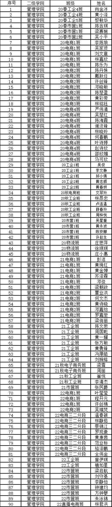 根據(jù)《廣東省教育廳關(guān)于做好2022年秋季學(xué)期學(xué)生資助工作的通知》和《廣州華立科技職業(yè)學(xué)院國(guó)家獎(jiǎng)助學(xué)金實(shí)施辦法(修訂)》、《廣州華立科技職業(yè)學(xué)院家庭經(jīng)濟(jì)困難學(xué)生認(rèn)定辦法(修訂)》等文件要求,經(jīng)學(xué)生本人申請(qǐng),管理學(xué)院領(lǐng)導(dǎo)小組進(jìn)行審核,現(xiàn)將學(xué)院初審認(rèn)定困難學(xué)生名單給予公示。如有異議者,請(qǐng)于公示期內(nèi)前將情況反饋到管理學(xué)院學(xué)管辦公室(西一505A)。