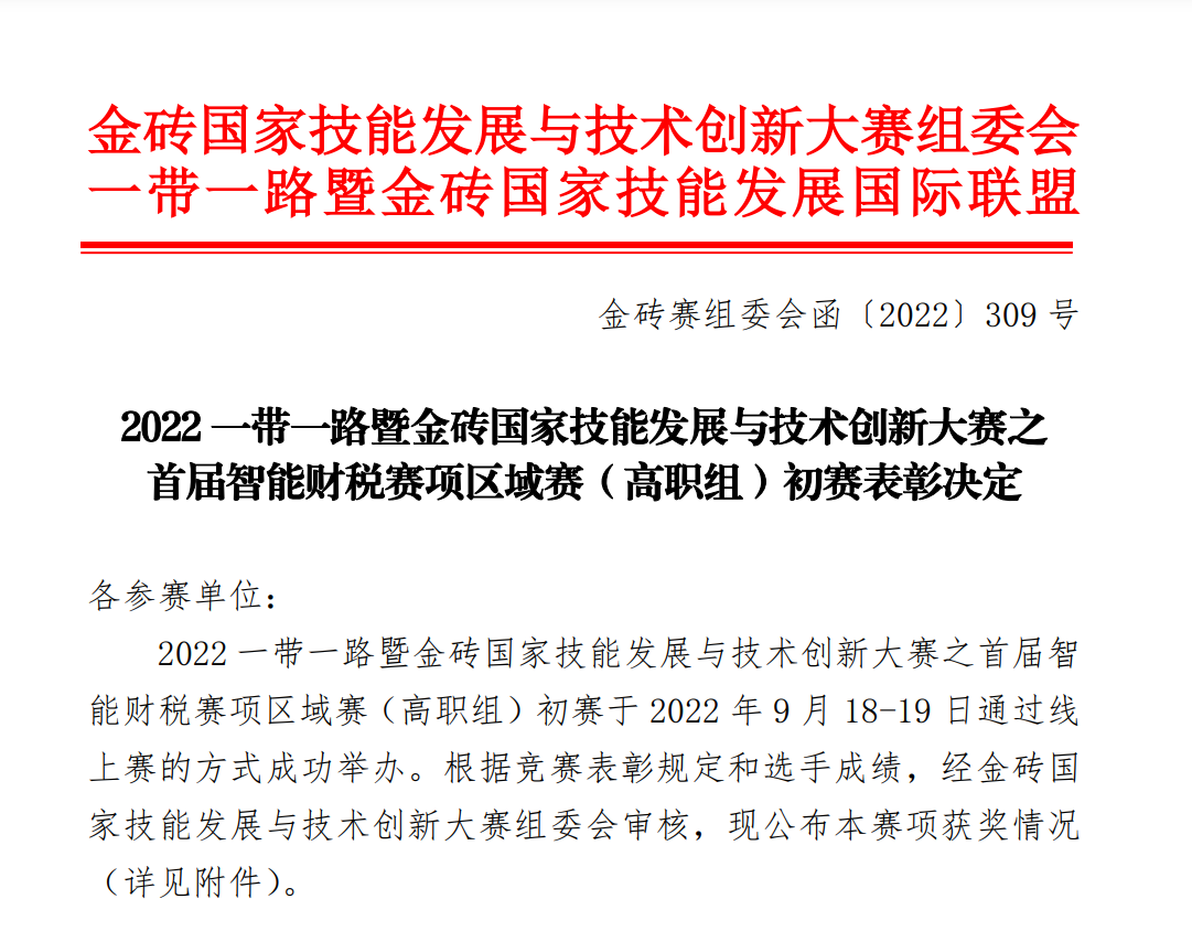 2022年9月18日,由金磚國家工商理事會(huì)、一帶一路暨金磚國家技能發(fā)展國際聯(lián)盟主辦的2022一帶一路暨金磚國家技能發(fā)展與技術(shù)創(chuàng)新大賽之智能財(cái)稅賽項(xiàng)(高職組)初賽在云端舉行,我校財(cái)經(jīng)學(xué)院20級(jí)大數(shù)據(jù)與會(huì)計(jì)(3+2)2班李宇、蔡依恂、林佑儒和李雪瑩組成的華立職院1隊(duì)(指導(dǎo)老師:何玉冰、馬瑞華)獲得國賽三等獎(jiǎng),;21級(jí)大數(shù)據(jù)與會(huì)計(jì)班朱潔茹、李柳嬋、鄭佳欣和詹鳳嬉組成的華立職院2隊(duì)(指導(dǎo)老師:王赟、歐陽偉籌)獲得國賽優(yōu)秀獎(jiǎng)。