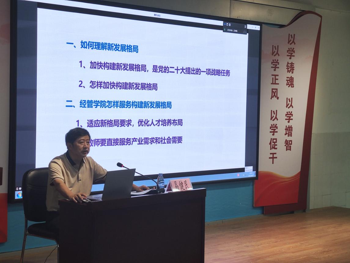 為推動(dòng)學(xué)習(xí)貫徹習(xí)近平新時(shí)代中國特色社會(huì)主義思想主題教育走深走實(shí),2023年6月7日下午,校長易健民教授、博士應(yīng)邀到經(jīng)濟(jì)管理學(xué)院開講專題黨課。易校長將自己研讀習(xí)近平總書記在《求是》雜志2023年第8期發(fā)表的文章和4月中旬視察廣東的重要講話、重要指示精神后的所思所感,結(jié)合當(dāng)前國內(nèi)外宏觀經(jīng)濟(jì)形勢分析,為經(jīng)濟(jì)管理學(xué)院師生黨員代表上了一堂立意深遠(yuǎn)、思想深刻的專題黨課。學(xué)校科研處處長溫偉勝、產(chǎn)教融合辦主任劉宇赤,經(jīng)管學(xué)院院長程玉賢、黨總支書記朱少先、副院長劉軍根以及兩校區(qū)教師黨員和學(xué)生代表(校區(qū)間視頻連線)共100多人參加了此次專題黨課學(xué)習(xí)。