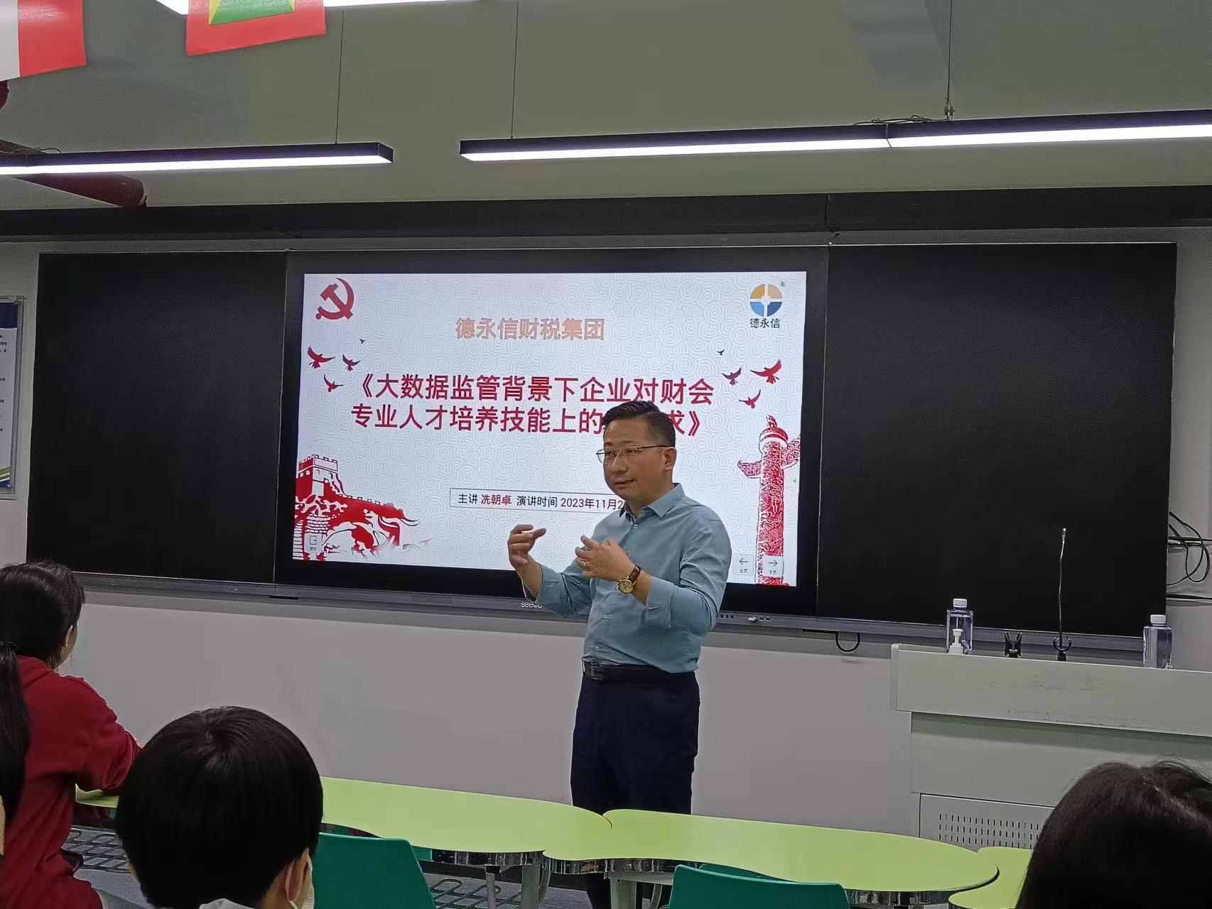 為深化校企合作、產(chǎn)教融合,了解行業(yè)發(fā)展新趨勢,促進(jìn)專業(yè)建設(shè)進(jìn)步,有效指導(dǎo)高職學(xué)生職業(yè)素養(yǎng)與崗位技能教育,11月22日下午,經(jīng)濟(jì)管理學(xué)院2023年企業(yè)精英進(jìn)校園,主題為《大數(shù)據(jù)監(jiān)管背景下企業(yè)對財(cái)會(huì)專業(yè)人才培養(yǎng)技能上的新要求》知識講座,在西3-210舉行,主講人為校企友好合作單位---深圳市德永信財(cái)稅集團(tuán)有限公司總經(jīng)理冼朝卓同志主講,經(jīng)濟(jì)管理學(xué)院副院長朱向平、教學(xué)主任冷長恒及部分教師代表、2022級財(cái)會(huì)專業(yè)學(xué)生代表出席了本場講座,講座由經(jīng)濟(jì)管理學(xué)院副院長朱向平主持。