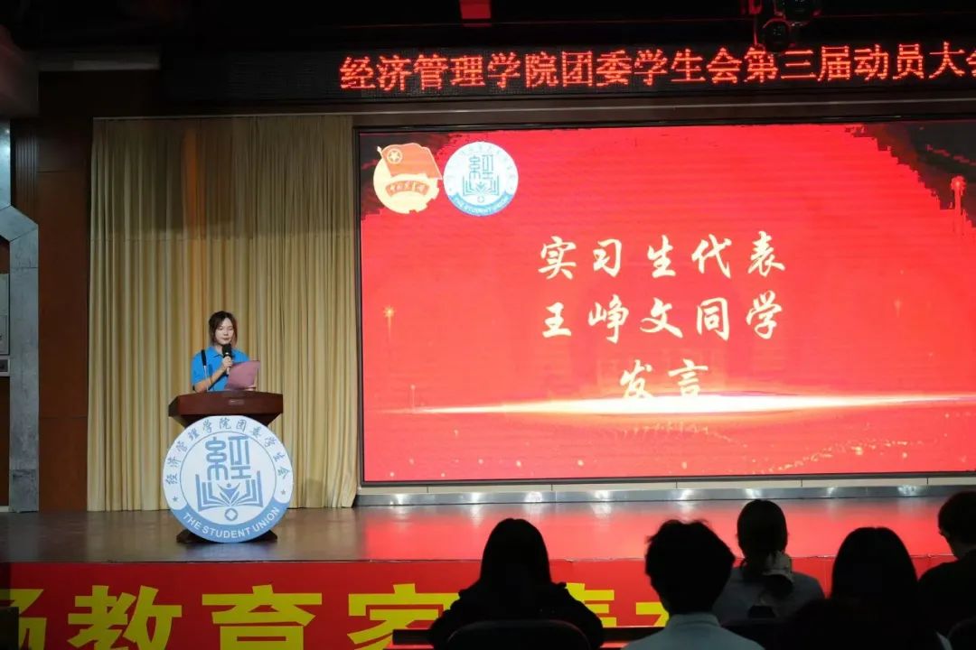 緊接著,實(shí)習(xí)生代表王崢文同學(xué)講述著成功加入經(jīng)濟(jì)管理學(xué)院團(tuán)委學(xué)生會(huì)的澎湃之情,表明在未來(lái)會(huì)秉持這份學(xué)習(xí)的態(tài)度及責(zé)任繼續(xù)勇往直前,提升自己的能力水平。