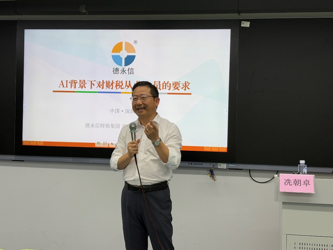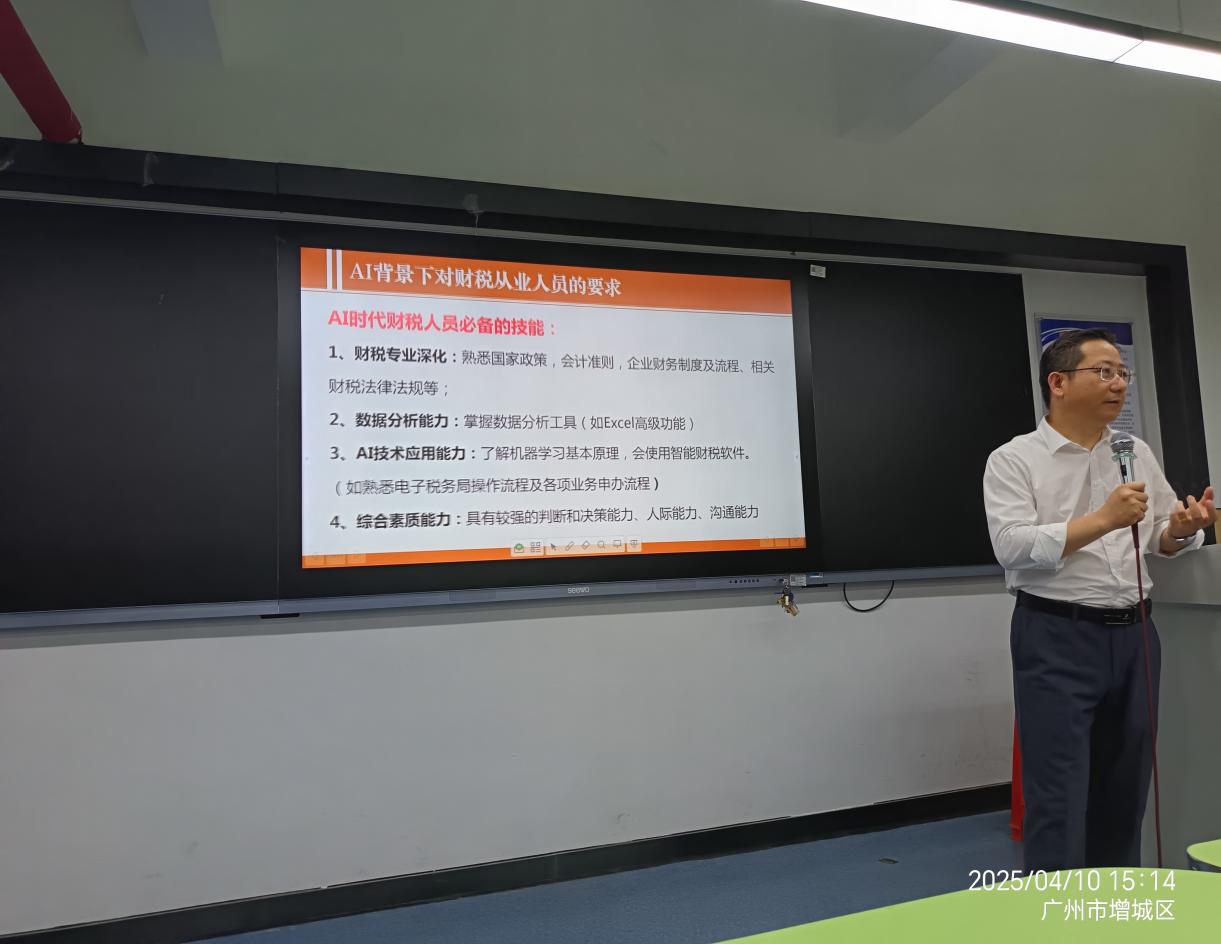 AI時(shí)代背景下,為了讓同學(xué)們破除認(rèn)知壁壘、避免職業(yè)危機(jī),引導(dǎo)他們精準(zhǔn)學(xué)習(xí),提升就業(yè)競(jìng)爭(zhēng)力同時(shí)激發(fā)他們的職業(yè)認(rèn)同感與轉(zhuǎn)型信心。2025年4月10日下午,經(jīng)濟(jì)管理學(xué)院特邀深圳市德永信稅務(wù)師事務(wù)所總經(jīng)理兼黨支部書記冼朝卓同志,在西三211教室成功舉辦了主題為“AI背景下對(duì)財(cái)稅從業(yè)人員的要求”的專題講座,此次講座吸引了眾多師生積極參與。