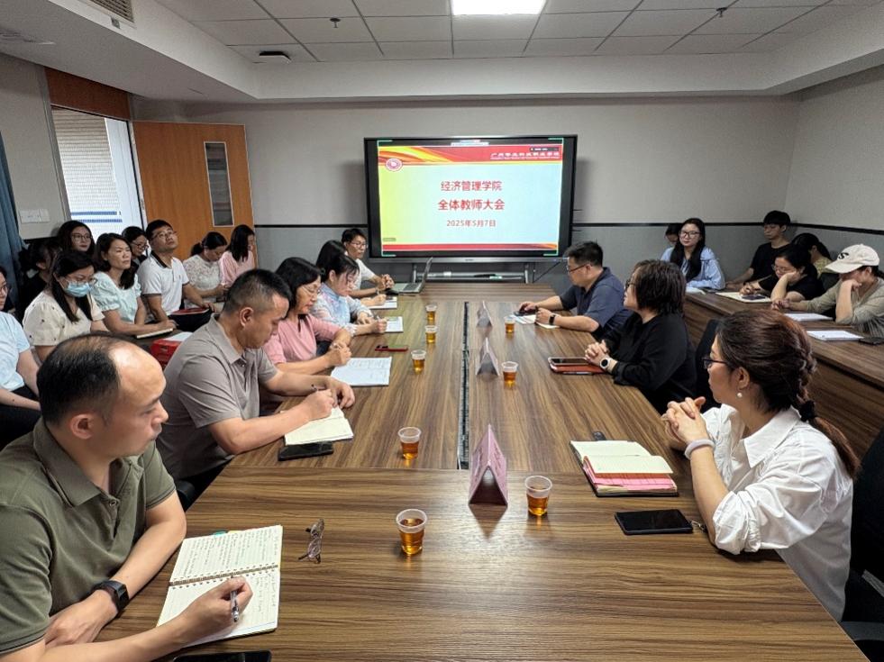 為推動學(xué)院高質(zhì)量發(fā)展,5 月7 日,經(jīng)濟管理學(xué)院與生活學(xué)院在西1-613 會議室召開全體教職工大會(連線云浮校區(qū))。學(xué)院全體教職工參會,常務(wù)副校長馬俊、校長助理葉春桃、人事處處長鐘文浩蒞臨現(xiàn)場指導(dǎo)工作,共商發(fā)展大計。