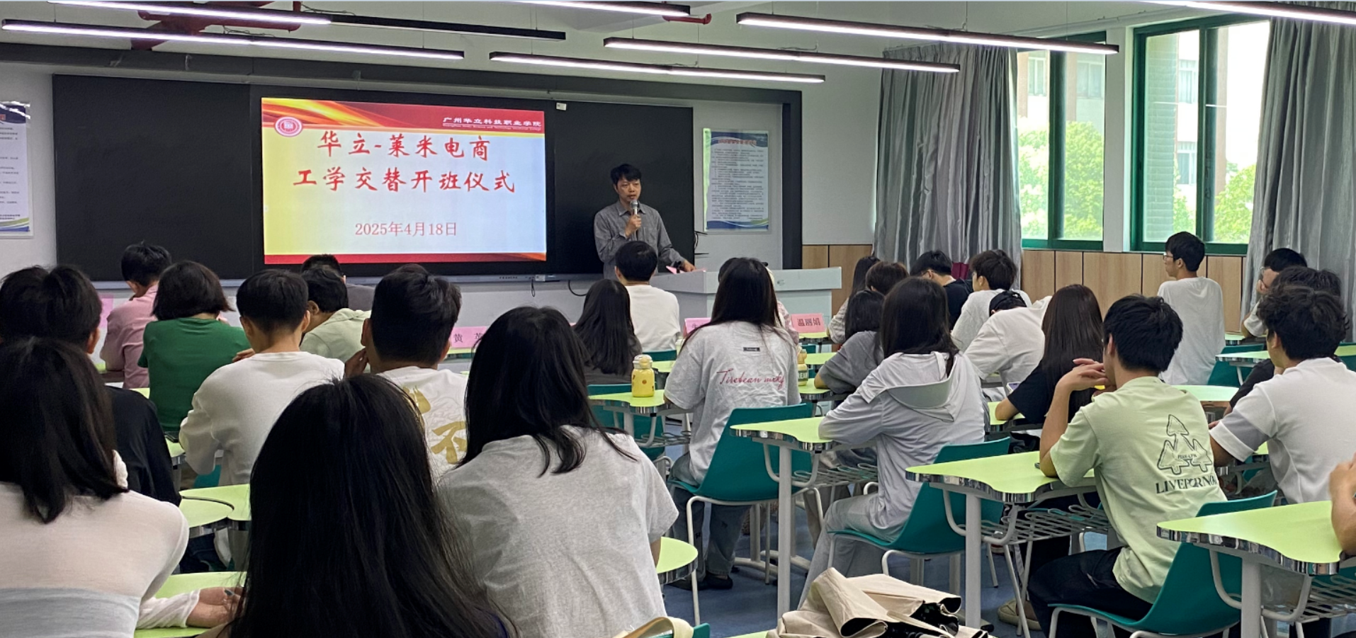 2025 年 4 月 18 日上午 10:30,“華立 - 萊米電商” 工學(xué)交替班開班儀式在西三 211 教室盛大舉行。廣州華立科技職業(yè)學(xué)院經(jīng)濟(jì)管理學(xué)院副院長朱向平、就業(yè)主任陳湛通、電商系主任黃英,劉淑琴、汪蔚等電商專業(yè)群骨干教師,攜手廣州萊米電商有限公司王闖經(jīng)理、相關(guān)項(xiàng)目的企業(yè)導(dǎo)師及工學(xué)交替班學(xué)生,共同開啟校企協(xié)同育人新篇章。