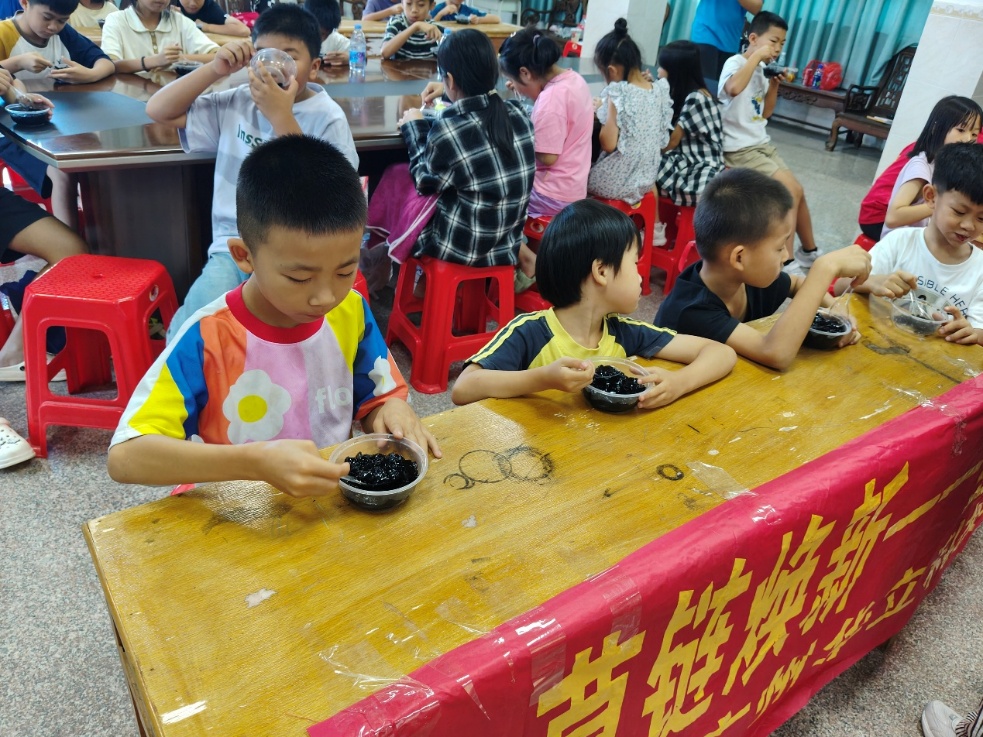 在品嘗環(huán)節(jié),更是熱鬧非凡。孩子們小心翼翼地舀起一塊黑涼粉,放進(jìn)嘴里,冰涼滑嫩的口感在舌尖化開(kāi),帶著恰到好處的甜味,瞬間驅(qū)散了夏日的燥熱?!巴郏煤贸?!”“像果凍一樣!”孩子們的歡呼聲此起彼伏,有的小朋友吃得嘴角沾了黑涼粉,像只小花貓,引得大家哈哈大笑。他們互相分享著自己碗里的涼粉,你一口我一口,那份簡(jiǎn)單的快樂(lè)在課室內(nèi)里傳遞開(kāi)來(lái)。