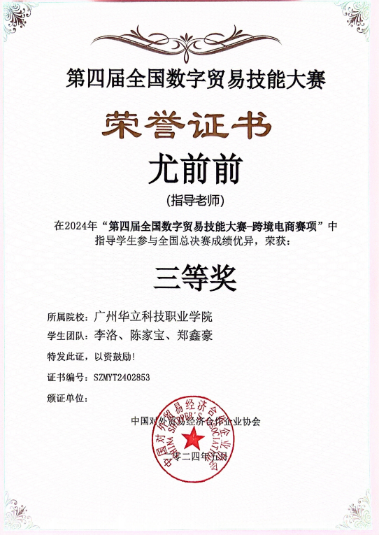 2024年“第四屆全國數(shù)字貿(mào)易技能大賽-跨境電商賽項(xiàng)”全國總決賽三等獎(jiǎng)