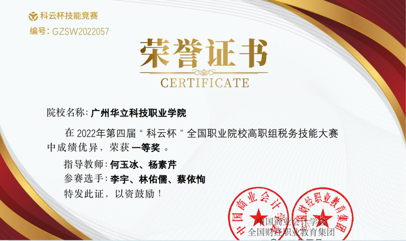 學(xué)生參加“科云杯”全國職業(yè)院校稅務(wù)技能大賽獲得一等獎(jiǎng)