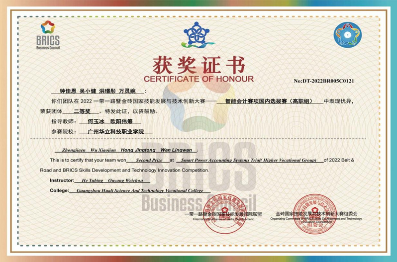 學(xué)生參加一帶一路暨金磚國家技能大賽“智能會計(jì)”賽項(xiàng)全國二等獎(jiǎng)