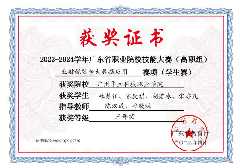 學(xué)生參加省級技能大賽“業(yè)財(cái)稅融合大數(shù)據(jù)應(yīng)用” 賽項(xiàng)獲得三等獎(jiǎng)